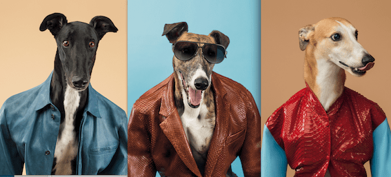 C’est le photographe animalier William Wegman qui a réalisé les nombreuses photos mettant en scène les lévriers… costumés (cuirs précieux) ou présentant des accessoires (sacs).