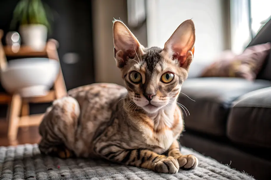 Toutes les couleurs et tous les motifs sont admis pour ce félin de taille moyenne d'un maximum de 4 kg. Malgré son pelage frisé, un brossage par semaine suffit pour éviter les noeuds.